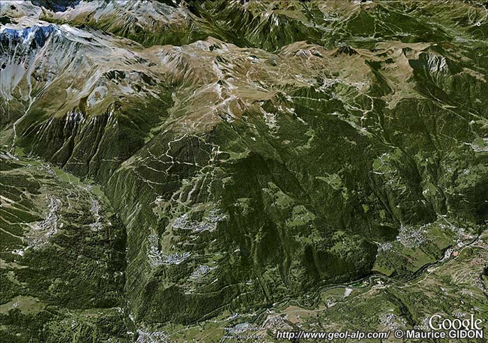 Cette même situation se prolonge jusque sur toute la transversale de Landry à Mâcot, affectant toutes les pentes essentiellement boisées de ce versant qui s'élèvent jusque à l'épaulement du sommet de l'ancien lit du glacier wurmien : ce dernier y est en outre accentué par la corniche rocheuse des quartzites triasiques (Carroley, Mont Saint-Jacques) qui couronne de façon stratigraphique ces pentes houillères (celle-ci s'efface toutefois au niveau de La Plagne où, sans doute en cette faveur, le versant dessine un rentrant ).