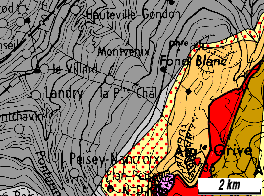 En abordant la partie moyenne de la vallée du Ponturin ce crêt des quartzites triasiques de l'aiguille Grive fait place à une échine partiellement rocheuse dont le saillant rétrécit le talweg en amont de Nancroix. D'autre part la continuité de ce crêt y devient très perturbée car il y est fragmenté en plusieurs panneaux séparés par des failles qui ont une direction proche de N-S et un rejet plus ou moins extensif, à lèvre orientale abaissée. Dans les panneaux ainsi découpés les quartzites triasiques y reposent sur des Gneiss du Sapey*, ici bien développés, et ils y supportent des calcaires plutôt massifs, souvent cargneulisés, dont certains sont considérés comme probablement post-triasiques (ressemblant en cela à ceux du Vallaisonnay).