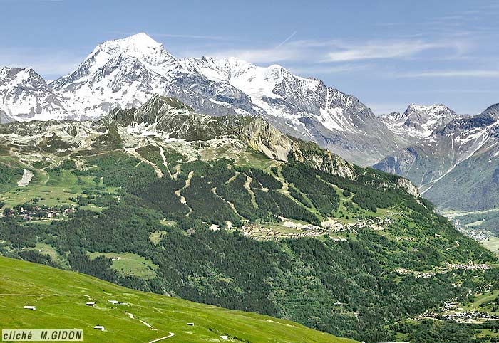 Le village de Peisey, maintenant rattaché à la station des Arcs en tant qu'extrémité méridionale de son domaine skiable. Il est bâti en rive droite du cours inférieur du torrent du Ponturin, qui sépare le massif du Mont Pourri de celui de Bellecôte, 3 km en amont de son confluent avec l'Isère (à Landry). Il est donc situé sur les pentes tout-à-fait inférieures de l'Aiguille Grive, qui s'ouvrent là en se connectant au versant, largement garni de placages de matériel glaciaire, abandonnés par l'ancien glacier wurmien de la vallée de l'Isère.