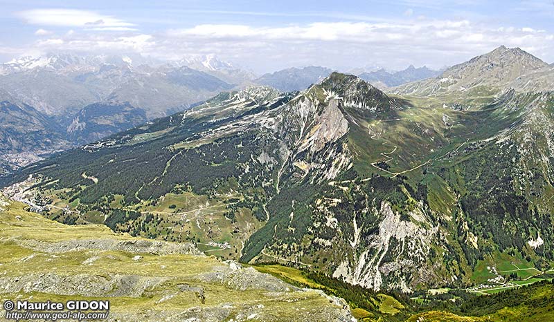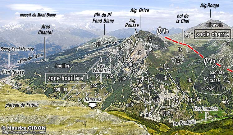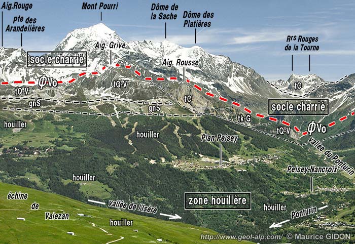 ![]() La rive droite du Ponturin à Peisey-Nancroix vue du nord-ouest, depuis les alpages du Mont Rosset (rive droite de la moyenne Tarentaise). Sous cet angle les plans successifs se profilent l'un sur l'autre, ce qui nuit à faire la distinction en le chaînon de l'Aiguille Grive de celui du Mont Pourri. Ils sont pourtant séparés par le large vallonnement du col de la Chal qui est déterminé par le chevauchement du socle de la Vanoise orientale sur la zone houillère (ØVo) : son tracé (masqué) est traversé transversalement par le Ponturin à mi-longueur de son cours. "gnS" = gneiss "du Sappey". |