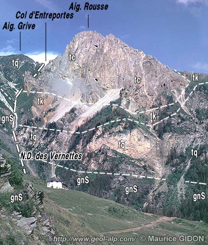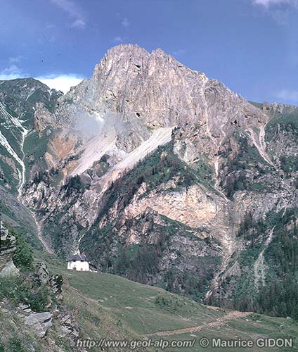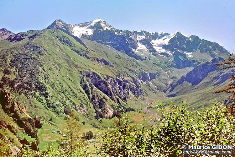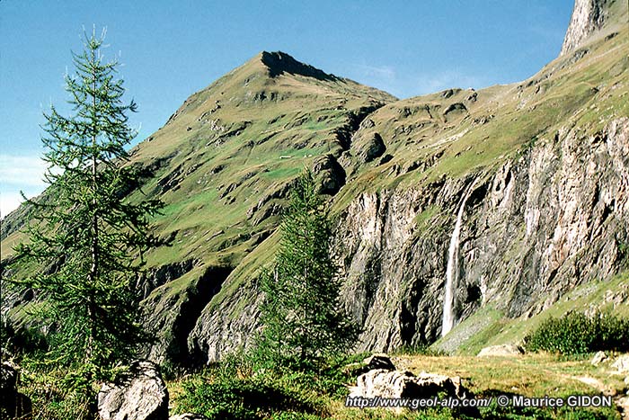 Bien que les schistes permiens soient en contact stratigraphique sur le socle (comme l'indique la présence des niveaux de schistes calcareux qui en sont le repère) ce dernier n'est représenté ici que par son terme inférieur de métaspilites chloriteux "rubanés". Les termes moyen et supérieur ne viennent compléter la succession que plus haut dans le versant au dessus du Refuge du Mont Pourri (voir aussi la page "Mont Pourri"). |