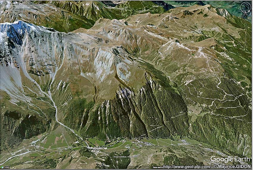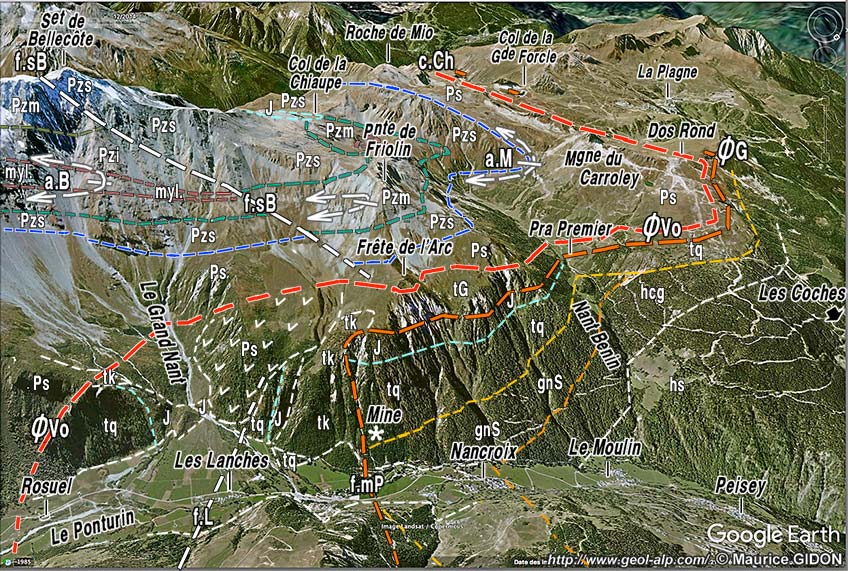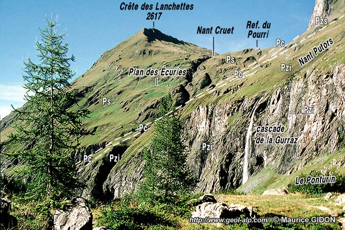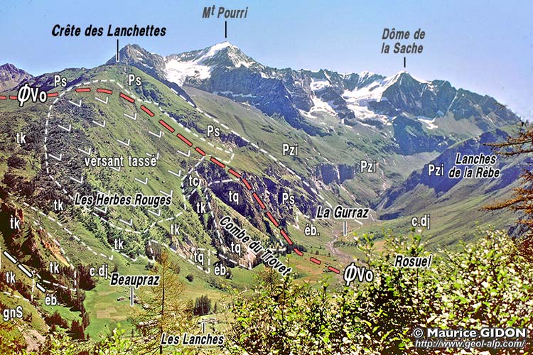 En effet, dans l'entaille du Ponturin aux abords du village des Lanches, on constate que les accidents qui sont associés à ces affleurements cargneuliques sont très redressés et que la bande ainsi disloquée s'enfonce profondément à la verticale (voir aussi la page "Mont Pourri"). Il s'agit là d'une disposition très proche de celle qui caractérise plus au sud-ouest la cicatrice de Champagny et qui porte à envisager que l'on trouve là son prolongement, décroché dans le sens dextre (voir compléments en fin de page).