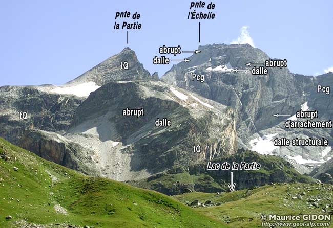 Sur le versant occidental, les épaulements qui soutiennent la crête, tel celui de la Pointe de la Partie, sont surtout constitués par les quartzites triasiques qui plongent avec un pendage proche de celui du versant : ils y forment de grandes dalles souvent coupées de falaises verticales ou surplombantes qui correspondent aux lignes suivant lesquelles se sont arrachées les tranches de couches éboulées.
