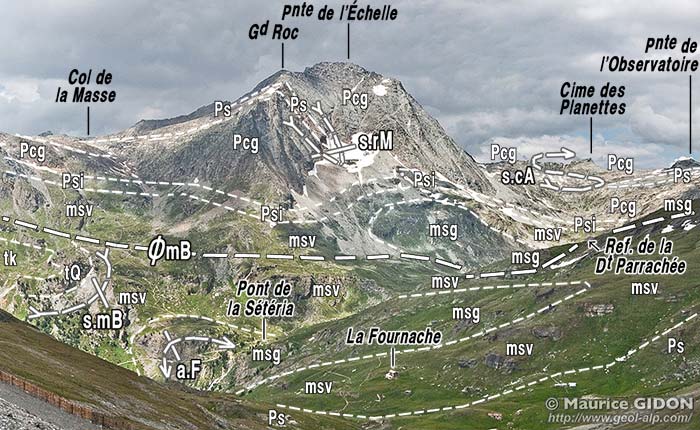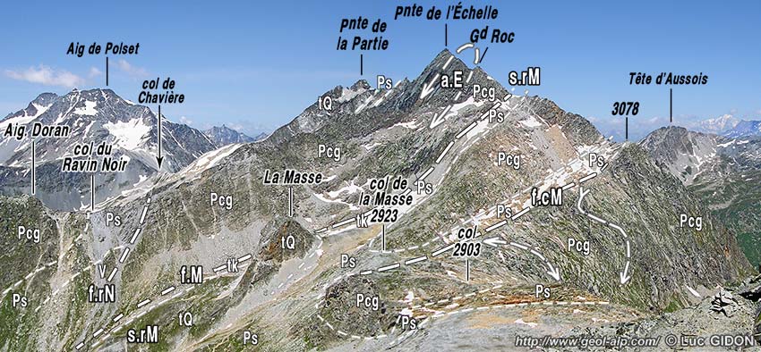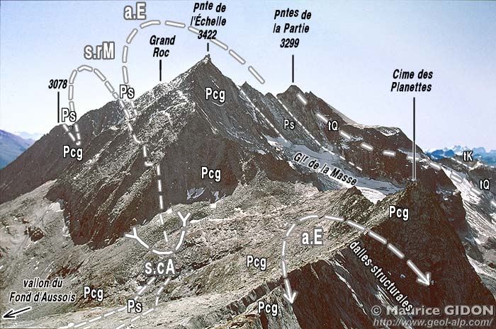![]() Le versant oriental de la Pointe de l'Échelle, vu des pentes de rive gauche du vallon des lacs d'Aussois, depuis le sommet des télésièges, au pied de la Pointe de Bellecôte (env 2650). s.rM : synclinal du ravin de la Masse ; s.cA = synclinal du col d'Aussois (prolongement du précédent ?) ; ØmB : chevauchement du Mauvais Berger : il occasionne un redoublement de la succession en faisant avancer vers l'est (vers l'observateur) les terrains permo-triasiques du Rateau d'Aussois, par dessus la succession du Plateau du Mauvais Berger : s.mB = synclinal du Mauvais Berger ; a.F = anticlinal de la Fournache. Pcg = conglomérats permiens ; Ps = Schistes clairs, chloriteux, permiens (Psi = niveau inférieur aux conglomérats) ; msv = micaschistes paléozoïques verts (supérieurs, "d'Ambin") ; msg = micaschistes gris (inférieurs, "de la Claréa" et de l'Arpont). N.B : Le tracé adopté ici pour le chevauchement à la traversée du Ruisseau de Saint-Benoît diffère de celui indiqué sur la carte géologique (qui le fait passer sous les abrupts de la pointe de l'Échelle, au dessus des micaschistes gris du Fond d'Aussois). |