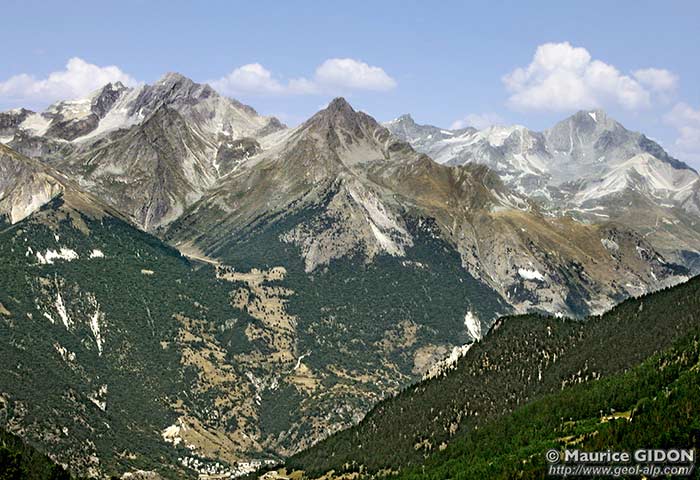 Les principaux de ces témoins sont : - celui du Barbier, qui se développe sur plusieurs centaines de mètres de dénivelée sous la cabane de ce nom, à l'ouest de la fenêtre EDF d'où descend la conduite forcée d'Avrieux : il ne montre que des calcaires dolomitiques du Trias moyen. - celui du Roc du Bourget, qui forme un gros piton dominant le village: ses couches sont redressées presque à la verticale et montrent une succession très "classique", comportant, sur les dolomies triasiques, des calcaires du Dogger et du Malm et se terminant par des marbres en plaquettes. |