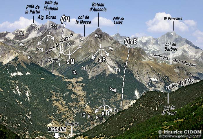Tous ces plis ont des axes qui plongent fortement vers le sud, de sorte que la voûte du matériel siliceux qu'ils affectent s'abaisse rapidement, jusqu'à s'enfoncer sous la vallée de l'Arc. Il ne réapparaît d'ailleurs pas sur la rive opposée, qui est occupée par les schistes lustrés piémontais (ceux-ci sont supposés avoir recouvert aussi le versant nord de l'Arc mais y avoir été enlevés par l'érosion.
