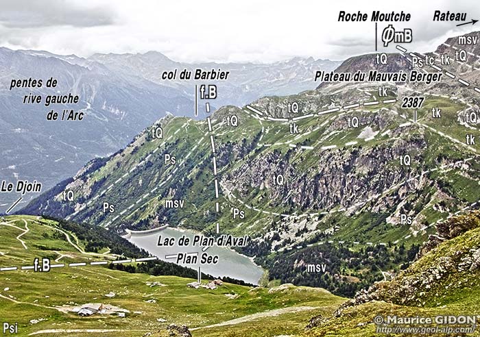 ![]() Le lac de Plan d'aval et les pentes orientales du Rateau, vus des pentes supérieures de Plan Sec. f.B = faille du Barbier ; ØmB = chevauchement du Mauvais Berger. |