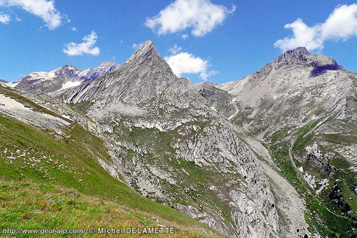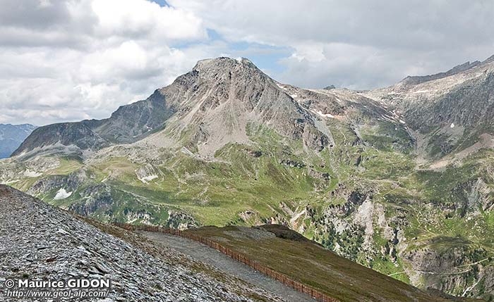 En contrebas de cette cassure majeure ce versant est formé en grande partie, du Bourget à Avrieux, par des dalles structurales de quartzites triasiques, ici orientées grossièrement E-W et inclinées vers la vallée de l'Arc. Sur ces dalles ne sont conservés que des placages discontinus de leur couverture carbonatée normale (voir aussi la page "Modane") : ils y ont été respectés par l'érosion à la faveur d'accidents secondaires, cassures mineures où ondulations synformes, qui ont aménagé des anfractuosités protectrices dans la surface de la dalle des quartzites. Cette disposition des couches, toutes inclinées vers la vallée, est la conséquence, dans ce secteur, du plongement général des structures en direction du sud (c'est-à-dire de l'ennoiement vers le sud du dôme structural de la Vanoise sud-orientale).