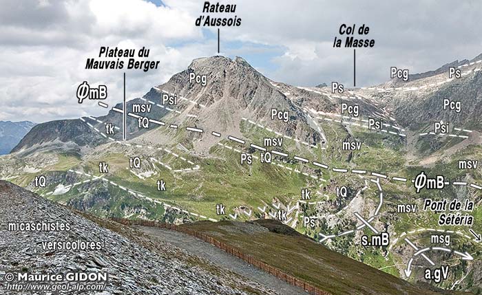 Vers le nord-est, passé l'épaulement du col du Barbier, ce dispositif structural se poursuit dans les pentes de la rive occidentale du vallon de Saint- Benoît, à l'ouest du lac de Plan d'Aval. On y constate que le chevauchement du Mauvais Berger y sépare un ensemble supérieur (chaînon du Rateau d'Aussois et de la Pointe de l'Échelle), doté de l'épaisse formation gréso-conglomératique permienne, de celui inférieur qui affleure sous le chevauchement et au niveau des lacs où le Verrucano repose directement sur les micaschistes verts "d'Ambin".