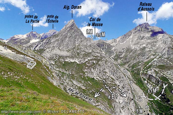 Je crois erroné le tracé adopté sur la carte géologique Modane, qui lui ferait remonter la pente sous les abrupts de la Pointe de l'Échelle, en amont du Pont de la Sétéria, pour contourner par l'amont les affleurements de micaschistes gris du Fond d'Aussois : en effet ce contact paraît normal, alors que ces micaschistes gris reposent anormalement sur les micaschistes verts (normalement supérieurs) dans les ravins de rive gauche en aval du refuge (voir les pages "Pointe de l'Échelle" et "Fond d'Aussois"). |