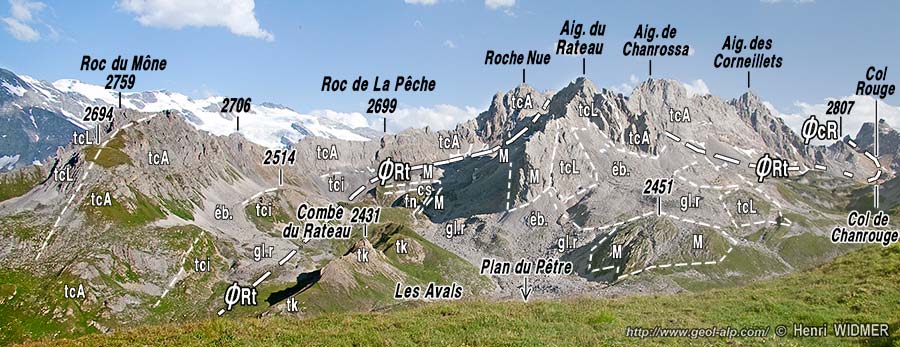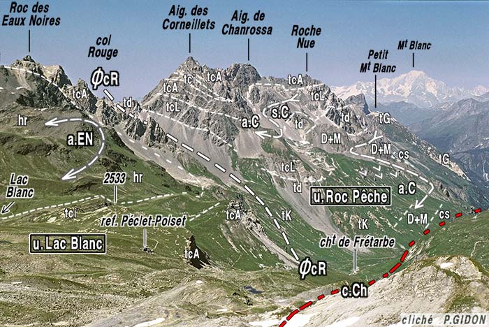 L'unité du Roc de la Pêche se termine immédiatement au sud de l'Aiguille des Corneillets, où elle est tranchée transversalement par le ravin descendant du Col Rouge : ce dernier suit la bande de cargneules qui jalonne la surface de chevauchement du Col Rouge par laquelle l'unité du Roc de la Pêche recouvre tectoniquement celle du Lac Blanc.