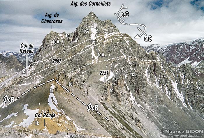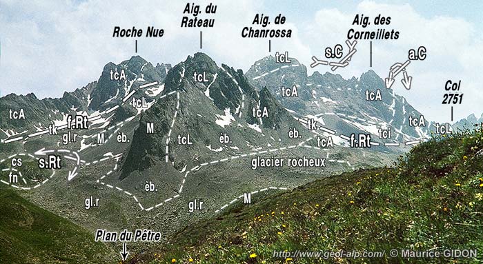 À l'extrémité méridionale de ce chaînon (entre la Motte et Ritord) les couches du versant oriental de l'Aiguille de Chanrossa sont en outre affectés par le repli en S des Corneillets. Son synclinal et son anticlinal, plutôt déversés vers le NW, ont des axes presque W-E, donc très obliques à la ligne de crête du chaînon et à la vallée du Doron de Chavière, et plongent fortement vers le NE : ils sont .