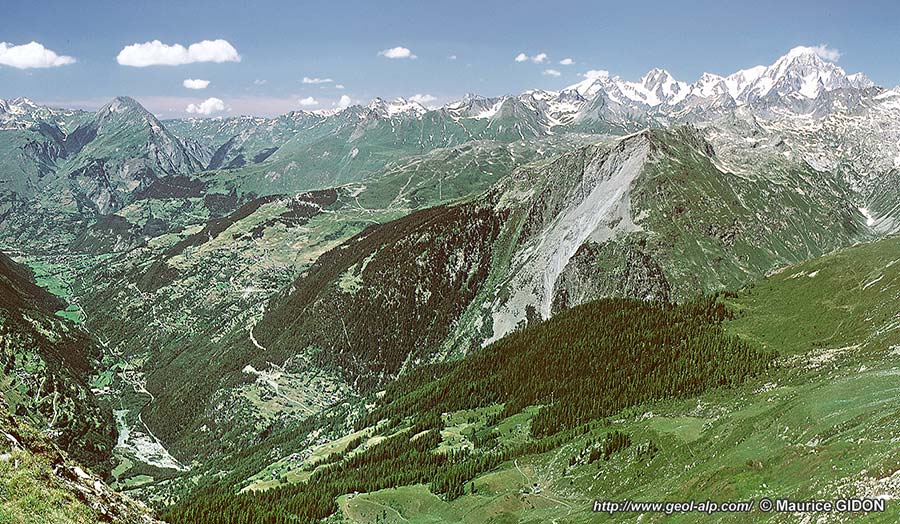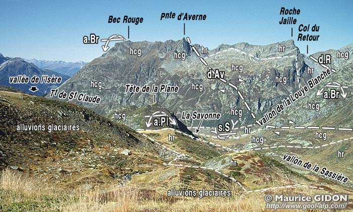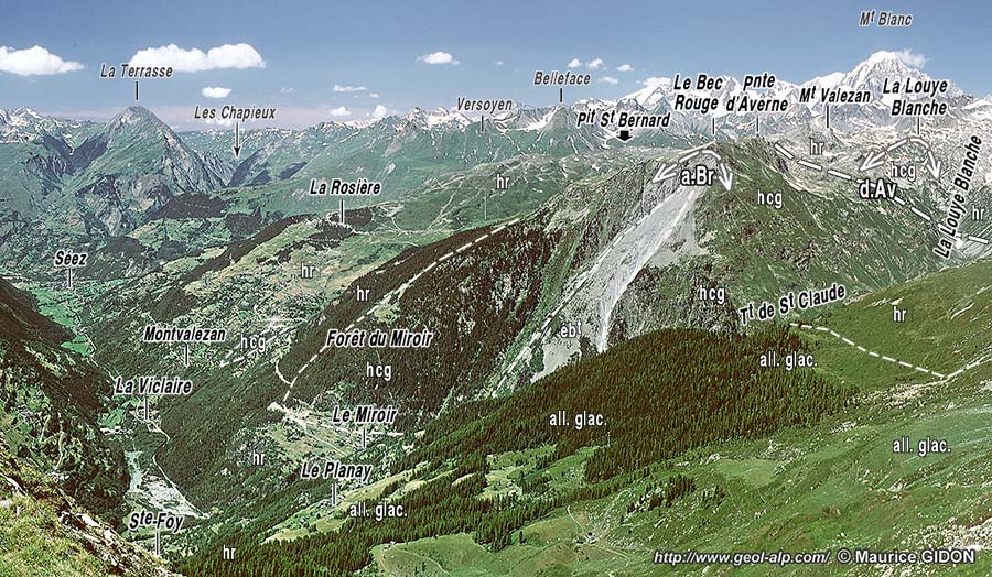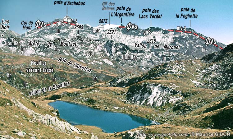 ![]() Le versant nord-occidental du chaînon de la Foglietta, vu du NW depuis les pentes orientales de La Rosière de Montvalezan. ØVs = chevauchement de la Vanoise septentrionale sur la zone houillère ; csjBr = brèches du Crétacé et du Jurassique reposant sur le socle cristallin ; tq = quartzites triasiques de l'unité de Pierre d'Arbine ; gnS = gneiss du Sappey ; Pzs = micaschistes sombres, du Paléozoïque supérieur de Vanoise orientale (voir la page "Mont Pourri"). |