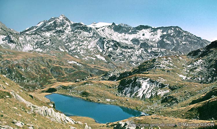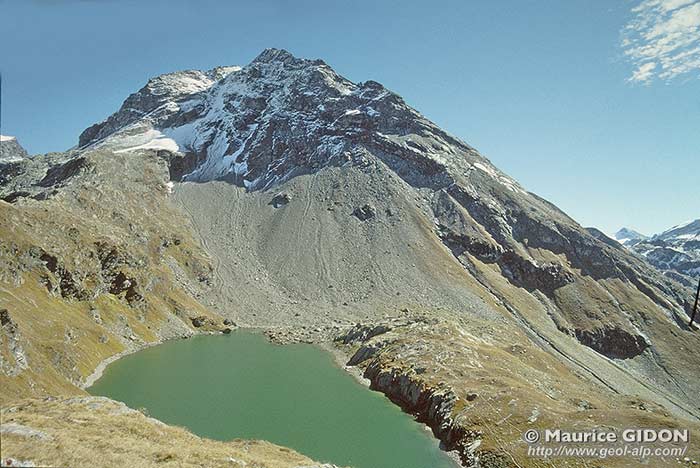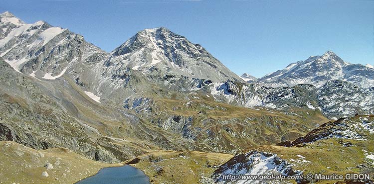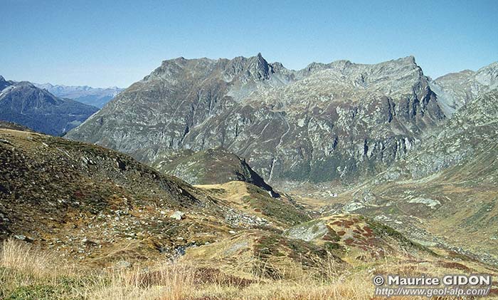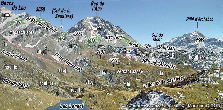![]() Le versant français de la crête frontière dans le haut vallon de la Sassière "prs" = prasinites et gabbros interstratifiés dans les micaschistes. |