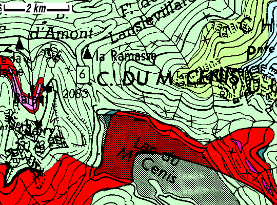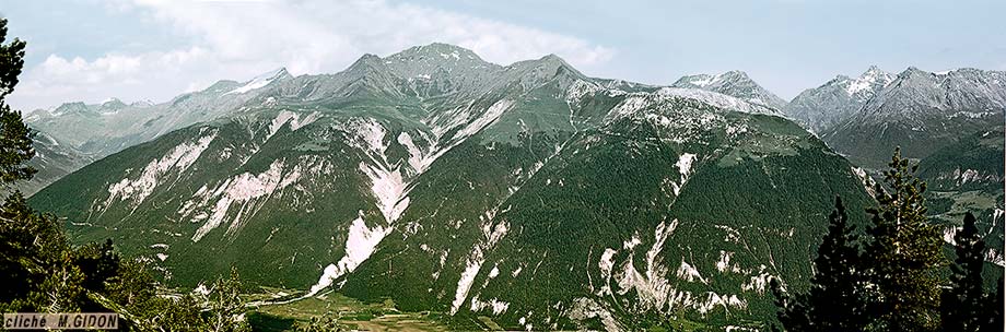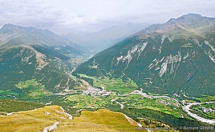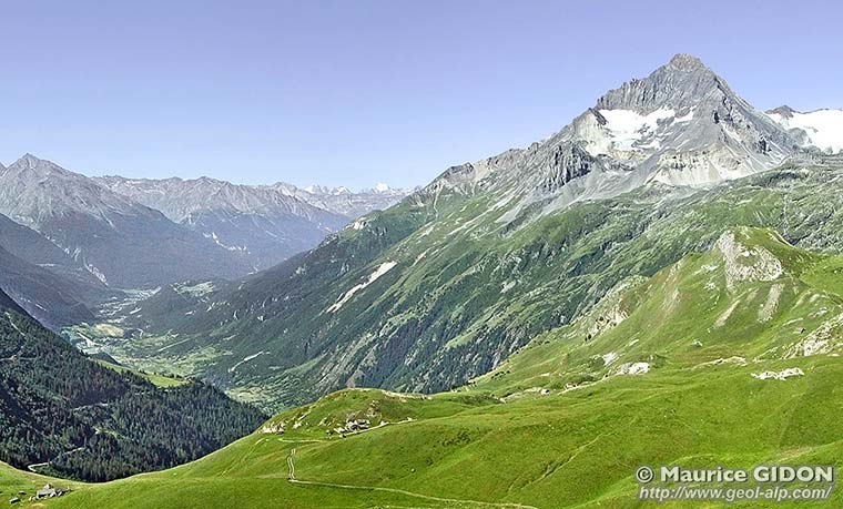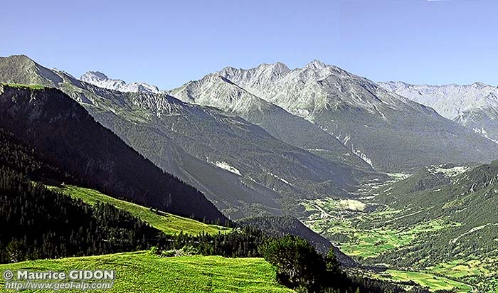 À Termignon le cours de l'Arc se coude brutalement à 90° pour prendre, plus au sud, jusqu'à Bramans une orientation presque N-S. Il évite ainsi, en la contournant et en la longeant du côté est, l'extrémité méridionale du bombement de socle cristallin du massif de Chasseforêt (voir la page "Chasseforêt") laquelle y disparaît sous le matériel sédimentaire de la Dent Parrachée (voir la page "Parrachée"). Du côté oriental (rive gauche) la partie haute du versant est couronnée par le large chapeau de schistes lustrés du Signal du Petit Mont Cenis.