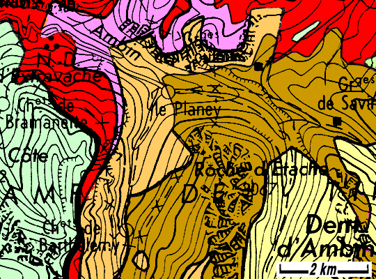 Liste des notations utilisées pour les schistes lustrés (entre crochets correspondances avec celles des cartes B.R.G.M): |