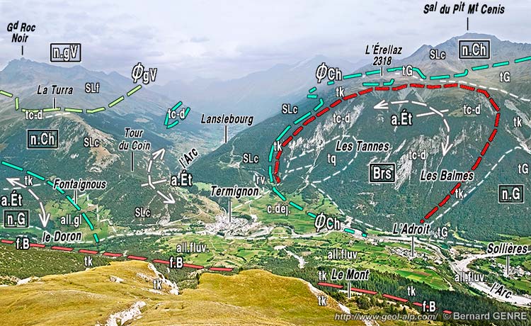Le coude de la vallée de l'Arc à Termignon, vu de l'ouest depuis La Loza (cliché original obligeamment communiqué par M. B. Genre). n.V = nappe de schistes lustrés du Grand Vallon ; n.Ch = nappe de schistes lustrés du Charbonnel ; n.G = nappe des Gypses ; Brs = couverture briançonnaise du massif d'Ambin ; a.Ét = anticlinal d'Étache ; f.B = faille de Bellecombe. suite du paysage vers la gauche à la page "Grand Roc Noir". |