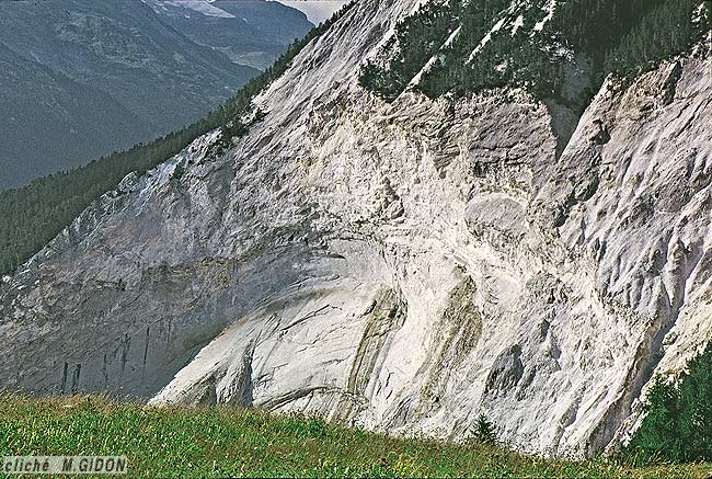 En rive gauche ces gypses et cargneules affleurent, en aval de Termignon, depuis le fond de la vallée jusque vers l'altitude de 2300 m, qui est celle des replats ceinturant la pyramide sommitale du Signal du Petit Mont Cenis, c'est-à-dire sur une dénivelée de plus de 1000 m.