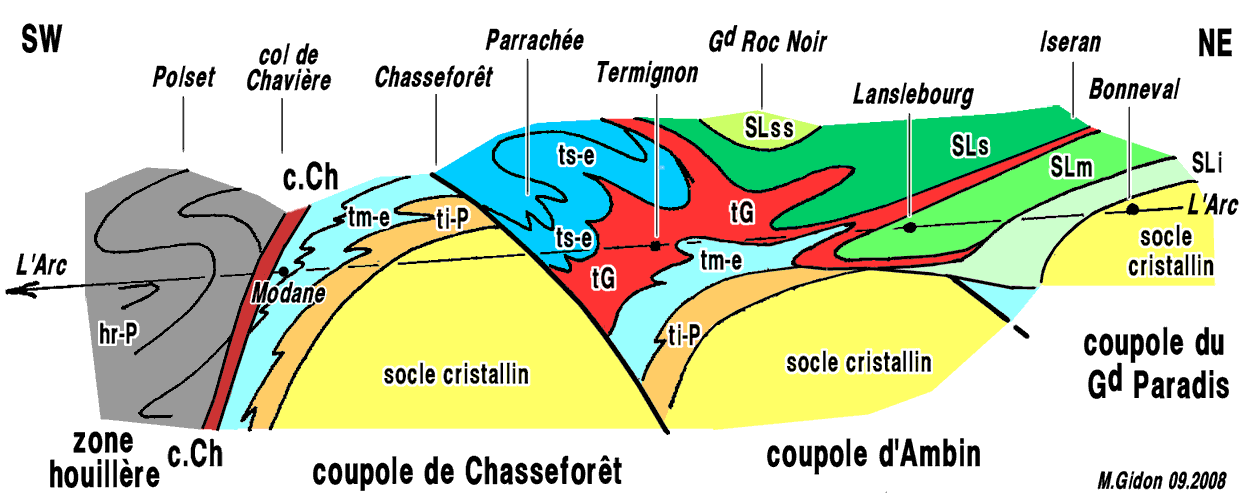 ![]() Coupe de la marge méridionale de la Vanoise, à peu près selon le tracé de la vallée de l'Arc Les relations géométriques entre les grands ensembles rocheux sont figurées de façon très schématique mais relativement objective, sans prendre en compte aucune hypothèse relative à leur mise en place. Noter que, de part et d'autre de cette coupe, le socle de Chasseforêt s'enfonce vers le sud tandis que celui d'Ambin et celui du Grand Paradis s'enfoncent vers le nord. De haut en bas s'empilent les unités tectoniques suivantes : SLss = unité des schistes lustrés sommitaux ; SLs, SLm = unités de schistes lustrés intermédiaires (" supérieures" et "médianes") ; SLi = unités de schistes lustrés inférieures. ts-e = séries carbonatées de type Grande-Motte (Trias supérieur à Éocène) ; tG = "nappe des gypses" ; tm-e = séries carbonatées briançonnaises (Trias moyen à Éocène) ; ti-P = Tégument siliceux du socle de la Vanoise orientale (Trias inférieur et Permien) ; hr-P = paléozoïque de la Vanoise occidentale. c.Ch = cicatrice de Chavière = faisceau de failles du linéament briançonnais oriental à cette latitude (voir la page spéciale consacrée à cet accident) |