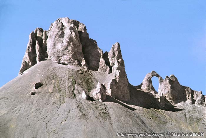 Ce sommet doit son nom à l'un des "gendarmes" de sa crête, qui est foré de part en part. Ce particularité de l'érosion s'explique par un l'effritement particulièrement efficace, par gélivation (sous l'effet du gel et du dégel) de ces calcaires anisiens préalablement "cargneulisés" (c'est-à-dire partiellement affectés par la fracturation hydraulique qui a fabriqué les cargneules affleurant alentour).