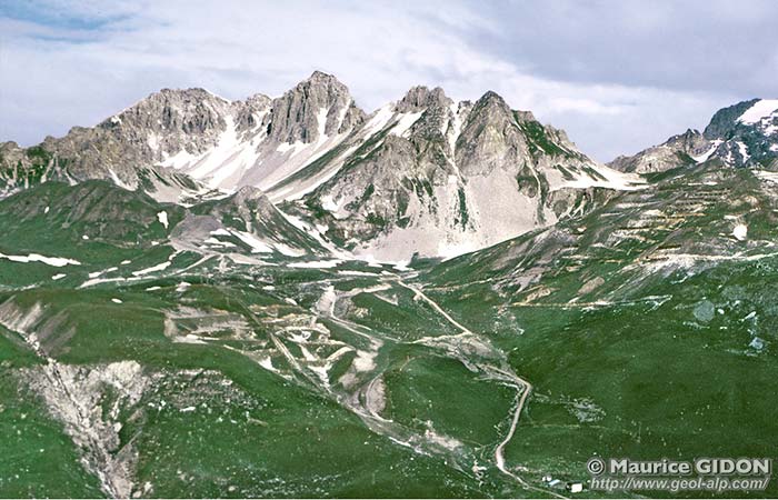 ![]() Le sommet de l'Aiguille Percée, vu du sud depuis les abords du lac du Chardonnet. Observer l'aspect ruiniforme typique des calcaires triasiques, avec le pied de leurs escarpements noyés sous une jupe d'éboulis de gélivation, plutôt fins et calibrés (décimétriques). |