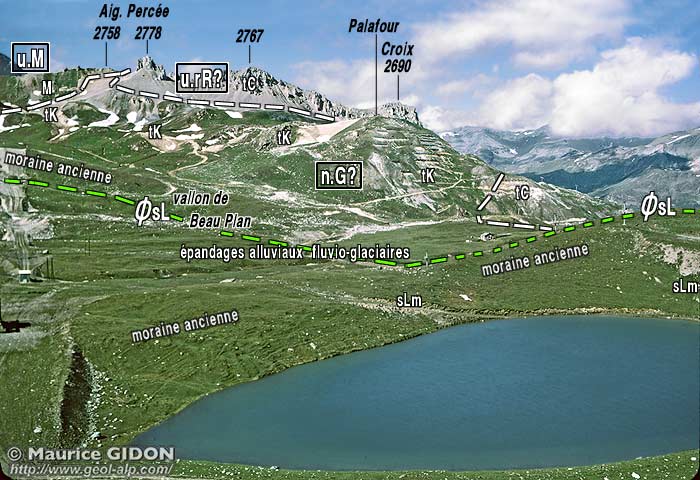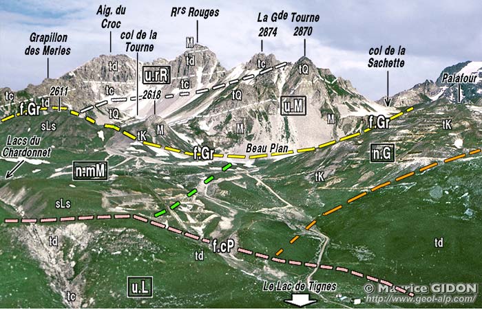 ![]() Les montagnes de rive gauche de la vallée de l'Isère à la latitude du barrage du Chevril,vues de l'est, depuis les pentes entre La Revirette et Le Saut. f.cP = faille du Col du Palet ; f.Gr = faille de Grattaleu ; a.V = anticlinal du Villaret ; ØS = chevauchement (rétrodéversé) de la Sache ; js = couches reposant directement sur les schistes cristallins du socle du Pourri (marbres calcaires, quartzites et brèches à niveaux datés du Callovo-Oxfordien). écailles imbriquées de la semelle siliceuse briançonnaise : ØV = chevauchement du Villaret ; ØF = chevauchement du Franchet. autres unités briançonnaises : u.rR = unité des Rochers Rouges ; u.M = unité briançonnaise du Marais (à couverture adhérente réduite : Malm et marbres en plaquettes) ; ØM = chevauchement du Marais. (pour les commentaires concernant les pentes inférieures du versant voir la page "Chevril"). |