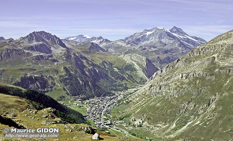 La station de ski de Val-d'Isère se situe à l'extrémité amont de la longue partie du cours de la vallée