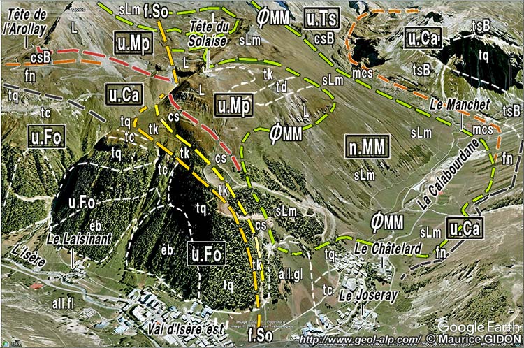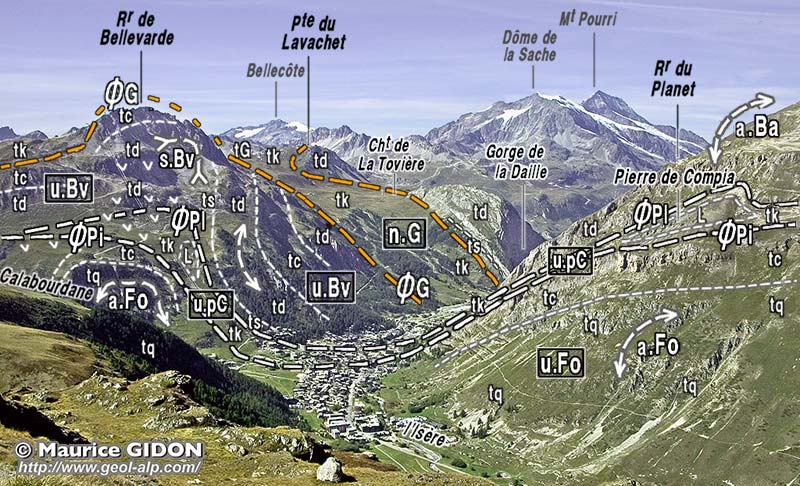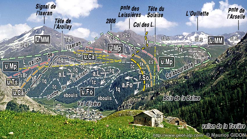 Tandis qu'à l'est de Val-d'Isère le talweg isérois coupe les contacts entre ces unités en biseau à angle aigu, au sud de Val-d'Isère le bas vallon de la Calabourdane, orienté N-S, les coupe de façon perpendiculaire. On y constate ainsi, comme à Solaise mais plus clairement, que les contacts entre les unités superposées y deviennent renversés jusqu'à l'horizontale : leur tracé se suit en effet à flanc de pente, pratiquement à la même altitude (voir page "Pissets").