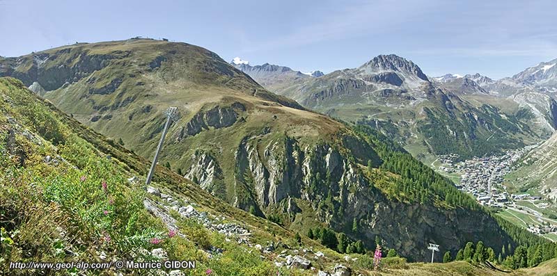 Presque la moitié du domaine skiable de Val-d'Isère se développe sur les pentes situées à l'ouest de l'agglomération, lesquelles culminent au Rocher de Bellevarde. La structure du versant SE de cette montagne, qui tombe sur l'agglomération, est compliquée et sa lecture rendue plus difficile encore par l'intervention de glissements de versant . Le versant nord, qui tombe sur le large vallon de la Tovière, offre heureusement une coupe naturelle qui permet d'en déchiffrer un trait majeur : il s'agit d'un vaste ploiement sigmoïde qui se greffe sur le flanc sud de l'anticlinal du Villaret et qui culmine par le flanc inverse d'un synclinal ouvert vers le SE (voir la page "Bellevarde").