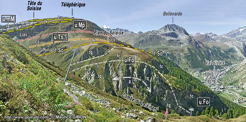Ces couches briançonnaises représentent clairement la partie la plus méridionale de l'unité du Fornet (voir la page "Franchet") : elles débordent sur cette rive sud de la vallée de l'Isère à la faveur d'un repli anticlinal visible dans la combe de Laisinant (voir plus loin). |