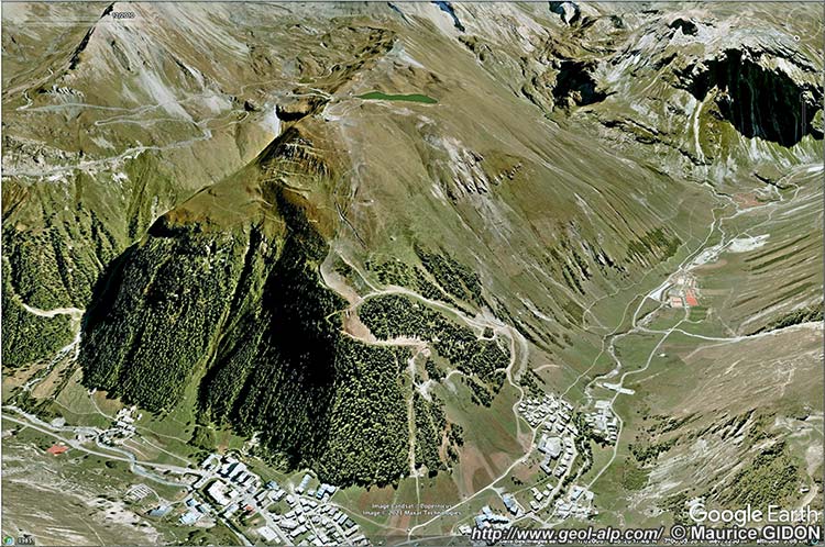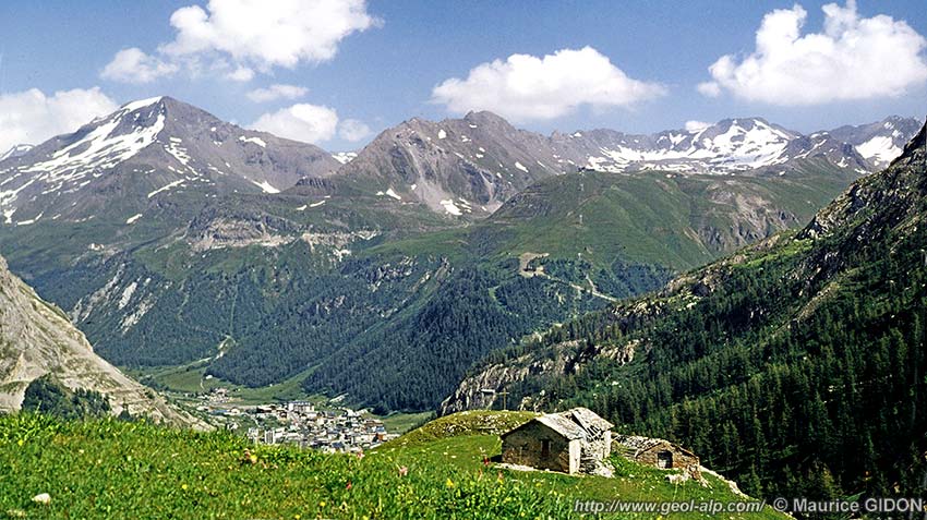 Le coeur de l'agglomération (c'est-à-dire l'ancienne bourgade) se trouve dans un secteur plus resserré, dominé à l'est (Rochers du Planet) par les abrupts du revers méridional du chaînon du Dôme. Ces pentes rocheuses menaçantes, que l'on a dû défigurer par l'implantation de pare-avalanches, sont surtout formées par les calcaires et dolomies triasiques des unités briançonnaises les plus orientales de la Vanoise (voir la page "Franchet").