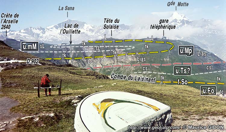 Du côté ouest de la Tête du Solaise la coupe de ses pentes par la vallée de la Calabourdane (voir la page "Bellevarde") montre d'abord que les affleurements de l'unité du Malpasset s'y limitent à l'échine sur laquelle sont installés les pylônes du téléphérique et qu'ils n'atteignent pas le fond de vallée. Leurs calcaires reposent en fait sur une bande de calcschistes que l'on peut (du fait de cette situation) attribuer à l'unité de la Tsanteleina.
