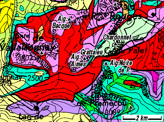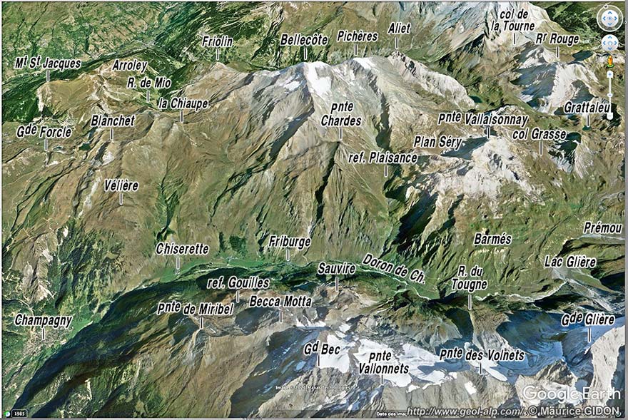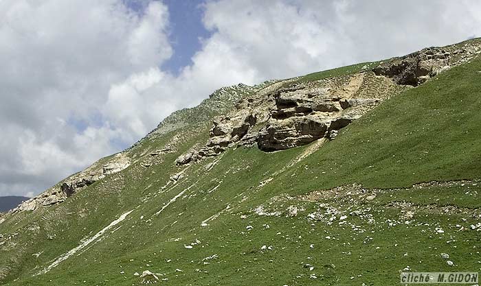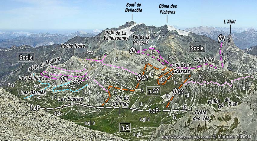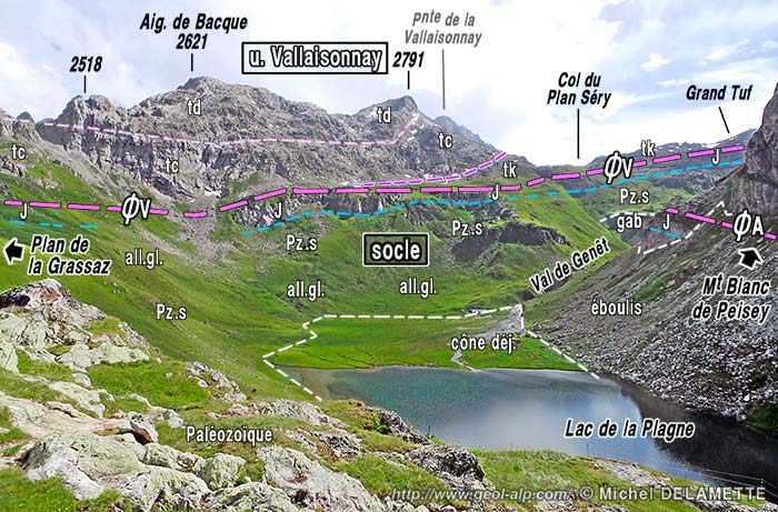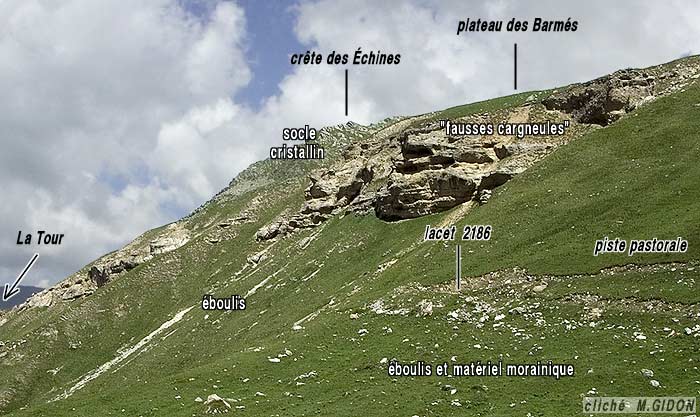 Plus précisément les pentes d'alpages des Barmés, de la Plagne et du Grand Plan qui s'étendent en pente relativement douce à la partie sud-occidentale du massif de la Vallaisonnay montrent essentiellement de larges affleurements de cargneules qui enveloppent le socle cristallin et sa couverture autochtone adhérente (ce dont on peut s'assurer à la faveur du fait que ces cargneules sont localement excavées jusqu'à la surface de ce socle).