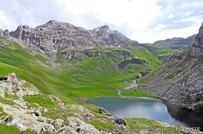 Le Lac de la Plagne, dont le déversoir est la source du Ponturin, occupe l'extrémité méridionale d'un sillon orienté N-S qui s'allonge sur 2,5 km entre les escarpements de l'Aliet à l'ouest et du Mont Pourri à l'est, ce qui correspond à la traversée des affleurements du socle cristallin paléozoïque. Sur ce trajet il conserve un fond plat presque horizontal ("Plan de la Plagne") qui est typique de son aménagement par creusement glaciaire. Ce creusement a été plus accentué du côté sud où convergeaient le glacier provenant du Plan de la Grassaz et celui du Val de Genêt au point que le lac y atteindrait plus de 150 m de profondeur, mais maintenant les déjections torrentielles provenant du Val de Genêt commencent à le colmater. A l'opposé, du côté nord ce sillon se termine par le verrou de La Rèbe au sortir duquel le cours du torrent tourne vers l'ouest. ... |