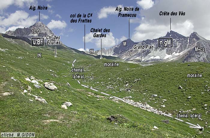 C'est à ce titre que ces fausses cargneules n'ont pas été distinguées des alluvions glaciaires sur la carte géologique au 1/50.000° feuille Moûtiers. Elles reposent sur un soubassement qui est de nature variable selon les points mais couvrent en particulier la large bande de vraies cargneules, rapportées à la nappe des Gypses, qui court d'est en ouest depuis la col de la Croix des Frettes en jalonnant la zone d'affrontement entre la nappe de la Grande Motte et les unités briançonnaises classiques du groupe de Laisonnay.