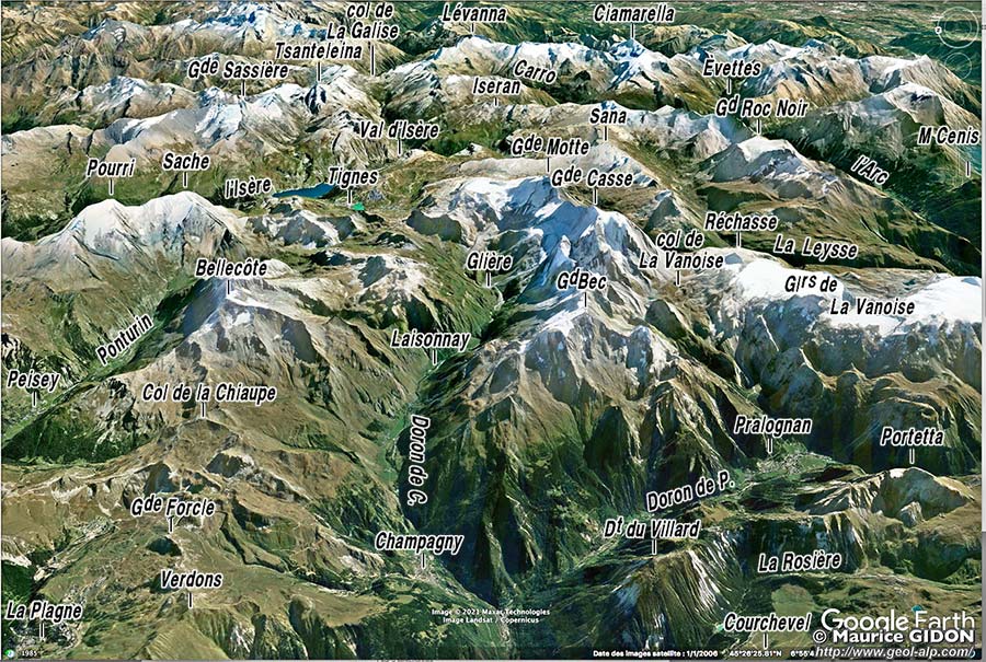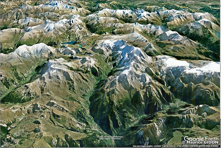 Le cœur du massif de la Vanoise vu de l'ouest avec, en arrière-plan, les parties connexes de la Haute Tarentaise et de la Haute Maurienne (vue pseudo aérienne d'après une image extraite de "google-earth"). On trouvera une vue d'ensemble des glaciers de la Vanoise aux pages "Chasseforêt" et voisines. |