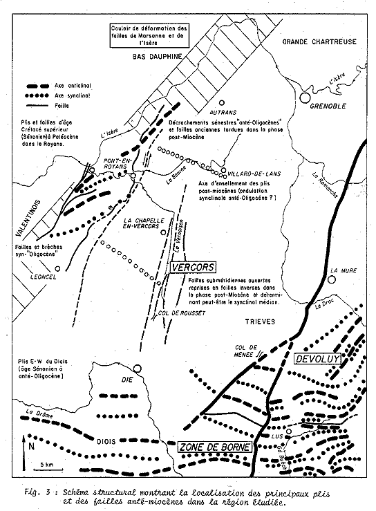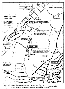 Carte d'ensemble, géologique et structurale du Vercors, simplifiée (extrait de ARNAUD H., 1976) AC : anticlinal des Coulmes NB : l'axe anticlinal dessiné, mais non désigné, au NE de Pont-en-Royans, est l'anticlinal du Nant (= "anticlinal de Malleval"), que l'on retrouve à l'est de Léoncel. |