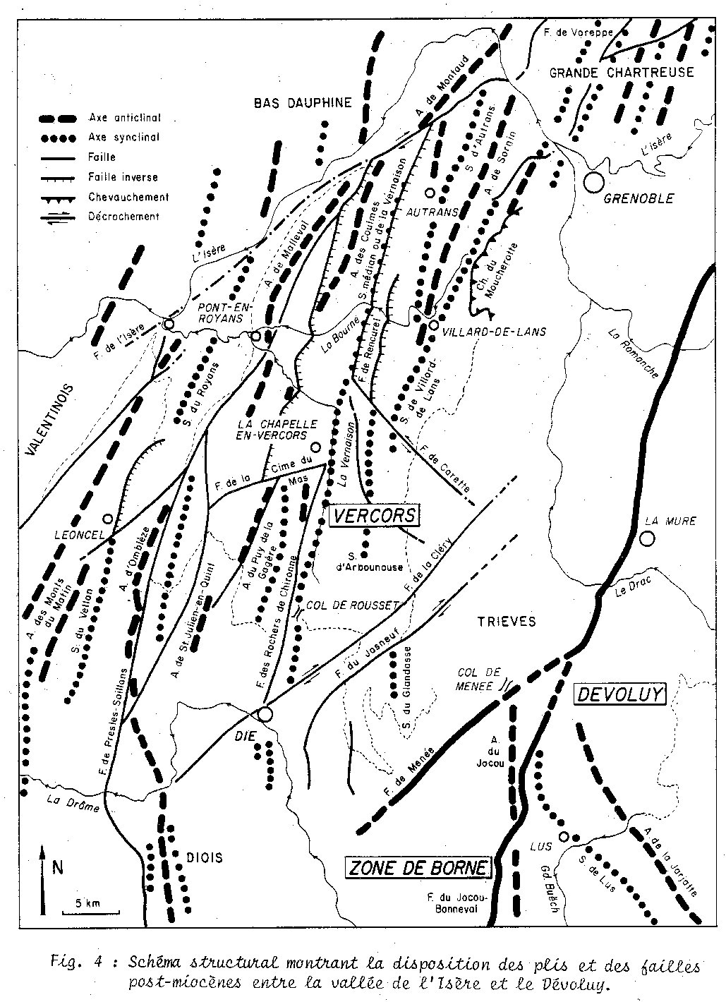 Légende des accidents tectoniques figurés (du NW au SE) aR = anticlinal