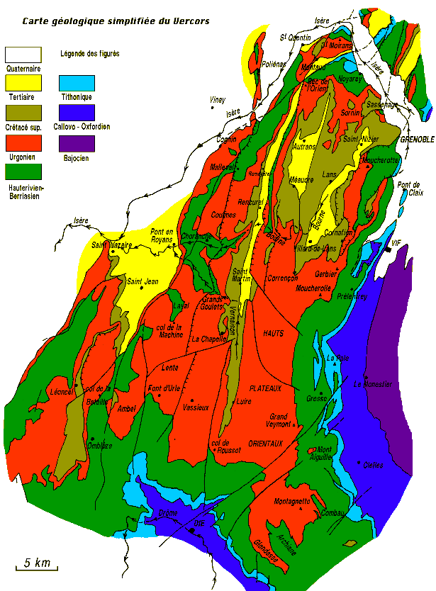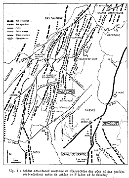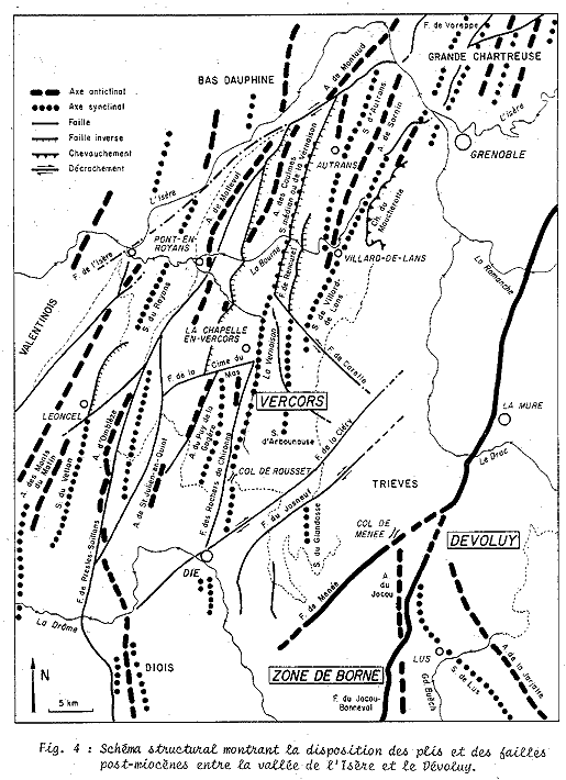 N.B : l'"anticlinal de Montaud" est le prolongement méridional exact de l'"anticlinal du Ratz" du massif de la Chartreuse. D'autre par l'anticlinal du Nant est appelé ici "anticlinal de Malleval". |
