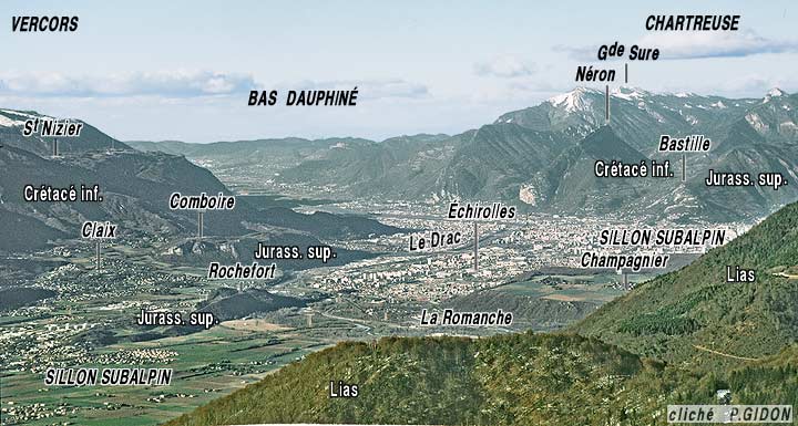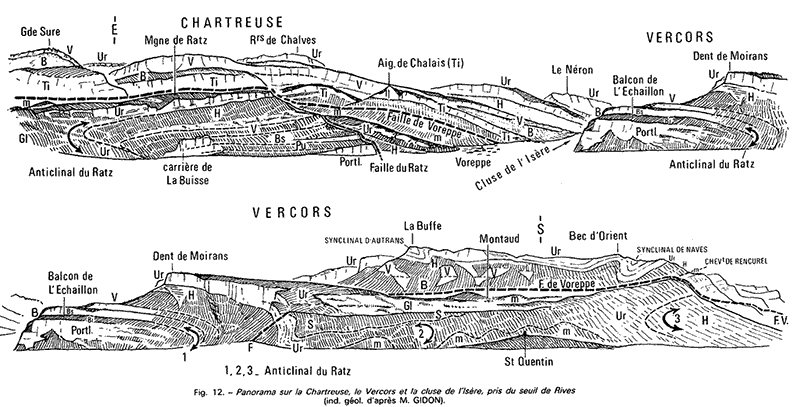 2 - Les plis qui affectent la lèvre orientale de cette frontière structurale sont franchement différents : l'on ne voit aucune relation entre synclinal du Néron au nord et anticlinal du Moucherotte au sud, même si l'on est tenté de considérer que l'Urgonien du Néron a une position similaire à celui des Trois Pucelles, c'est-à-dire au flanc ouest d'un anticlinal dont le cœur visible paraît constitué au nord par le Tithonique du chaînon de la Bastille - Rachais et au sud par celui de Comboire (et sans doute de Pont de Claix).