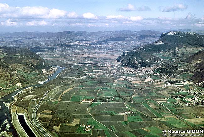![]() La "cluse de l'Isère" à son débouché aval, vue d'avion, depuis le SE vers le NW, c'est à dire de l'amont vers l'aval. Le Bec de l'Échaillon et la Montagne de Ratz sont les deux morceaux d'un même "mont" jurassien, coupé presque transversalement par la vallée. Ils appartiennent au chaînon le plus méridional du Jura qui ait été dégagé par l'érosion de l'ennoiement sous les molasses du Bas Dauphiné (il diffère en cela des autres chaînons jurassiens plus occidentaux, comme celui de Poliénas). L'ombilic de Moirans est une plaine alluviale fluvio-lacustre qui occupe la zone surcreusée par les glaciers quaternaires au débouché de la Cluse, à la faveur des oscillations de la position de leur front. La photo date de 1968, époque où la plaine alluviale était encore très agricole et où l'autoroute A.48, construite à l'occasion des jeux olympiques, s'arrêtait à Veurey (angle inférieur gauche du cliché) ... |