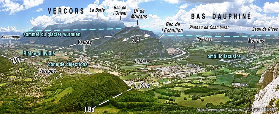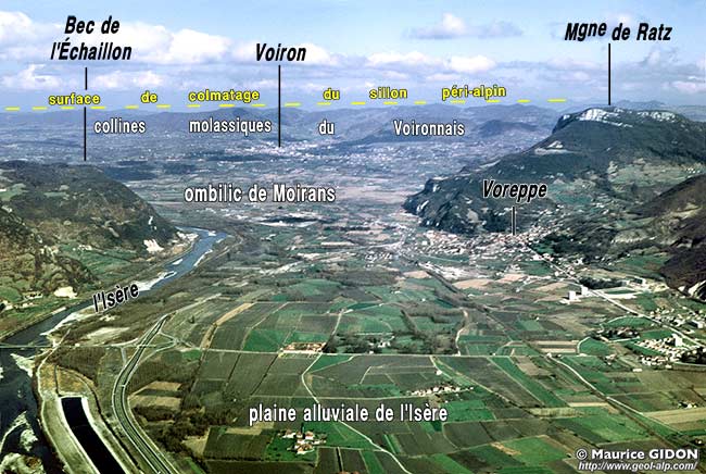 Les extrémités de ces langues glaciaires se sont étalés à sa sortie, dans le sillon périalpin, en y laissant des moraines qui sont disposées concentriquement autour de l'ombilic* de Moirans que ceinturent les pentes du plateau de Chambaran et les collines de Voiron. On désigne par ce terme la zone la plus surcreusée par les glaces, qui fut ensuite longtemps occupée, après leur fonte, par un lac (qui remontait d'ailleurs loin en amont, jusqu'à inclure tout le Grésivaudan). Son fond est entièrement occupé par une plaine alluviale d'une largeur moyenne de 3 kilomètres, constitué par les alluvions d'origine fluviatile qui ont colmaté ce lac.
