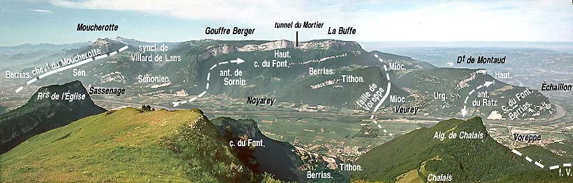 ![]() La trouée de l'Isère : Panorama de sa rive droite vu depuis sa rive gauche, du col des Bannettes. Seules sont indiquées les structures majeures, de rupture ou de torsion des couches. |