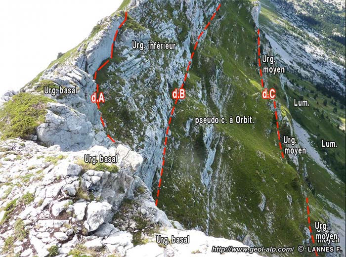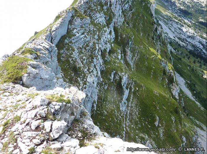 De fait l'examen de la crête rocheuse elle-même montre que la "dalle des Agnelons" qui constitue le glacis du versant oriental repose en discordance sur les couches supérieures du versant occidental, qui pendent plus fortement vers l'est.