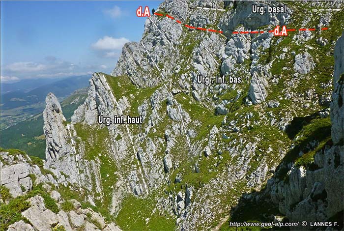 Détail (vu du sud) de la rive septentrionale supérieure du couloir situé à l'ouest de la Double Brèche. (cliché original obligeamment communiqué par M. François Lannes). d.A = surface de discordance (renversée) entre la dalle du Ranc des Agnelons et l'Urgonien inférieur "bas" : ce dernier est plus massif que celui appelé "haut", qui comporte deux niveaux ébauchant des vires mineures. |
