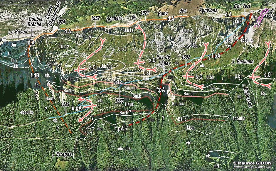 Cette succession de couches qui courent à flanc du versant est tranchée par la faille du Pas de l'Àne qui traverse le versant obliquement en déterminant le ravin dont le sommet correspond à ce lieu-dit. Son rejet verticale consiste en un soulèvement d'ailleurs peu important de sa lèvre septentrionale. Il est plausible qu'elle se poursuive vers le NW, sous le replat d'éboulis de La Baraque (point 1602), en direction du Col Vert.