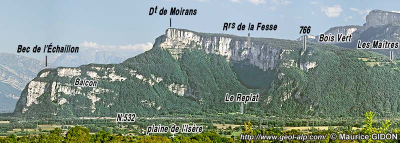 B/ Du côté ouest au contraire la coupole boisée du sommet de la Dent de Moirans est tranchée par de hauts escarpements qui dominent un talus boisés qui rejoint la plaine de l'Isère. Plus au nord, au Bec de l'Échaillon c'est un puissant abrupt qui tombe directement sur cette dernière. Ce versant donne ainsi une coupe de la succession du cœur de l'anticlinal du Ratz depuis l'Urgonien jusqu'au Jurassique supérieur. On voit que sous la falaise urgonienne il ne s'y dessine qu'un seul talus, celui de l'Hauterivien et du sommet des calcaires du Fontanil : ce trait trahit à lui seul le fait que l'on est sorti là du domaine paléogéographique subalpin pour rentrer dans celui jurassien.