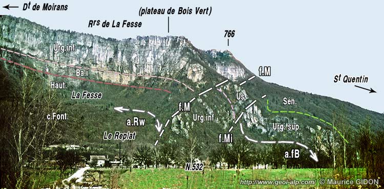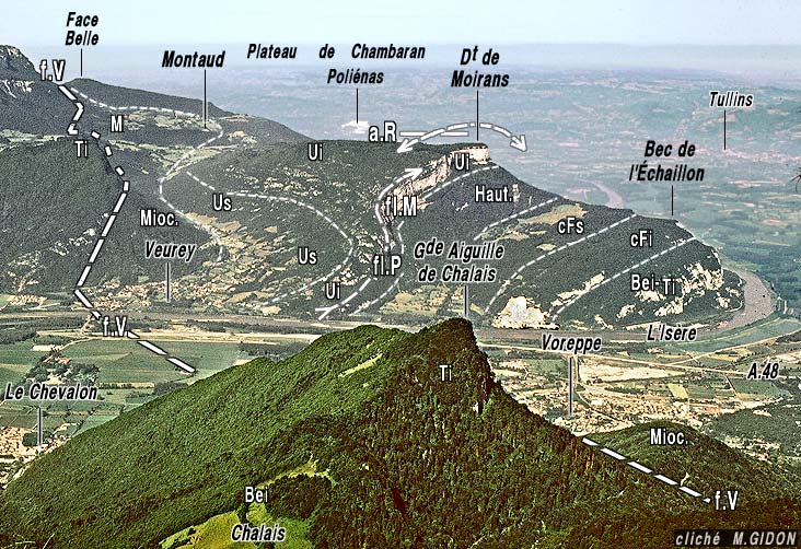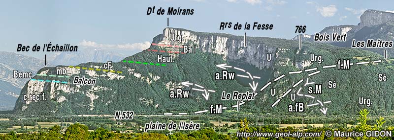 ![]() Le petit chaînon de la Dent de Moirans, vu de l'est, depuis les Bannettes (massif de la Chartreuse). f.V = faille de Voreppe ; flP = flexure de la Poste de Voreppe ; flM = flexure de la Dent de Moirans ; a.R = anticlinal du Ratz. cFi = calcaires du Fontanil inférieurs, ici pratiquement sans niveaux marneux intercalaires (faciès péri-récifal, dit "marbre bâtard") ; Bei-Ti = Calcaires coralliens de l'Échaillon, faciès jurassien des niveaux allant du Berriasien moyen au Tithonique supérieur. L'arrière-plan (environs de Montaud) est examiné à la page "Montaud". |