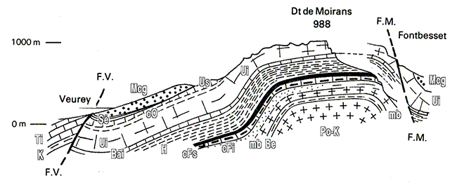 ![]() Coupe de la rive gauche de l'Isère à la hauteur de Veurey fl.P = flexure de Noyarey ; ØB = chevauchement de la Bournay ; sV = synclinal de Voreppe ; fl.P = flexure de la Poste de Voreppe (raccord entre le fond et le flanc ouest de sV) ; fl.M = flexure de la Dent de Moirans et des Bains de l'Échaillon (raccord entre la voûte et le flanc est de a.R) ; a.R = anticlinal du Ratz (voûte horizontale du pli) ; f.M = faille de Montaud. V-Bs = calcaires du Fontanil ; B-K = calcaires récifaux du Jurassique supérieur (Berriasien inférieur- Kimméridgien). |