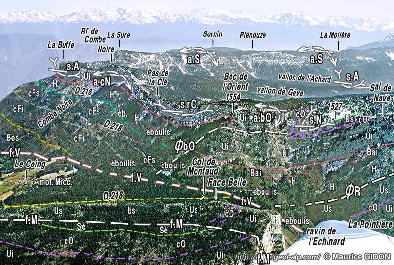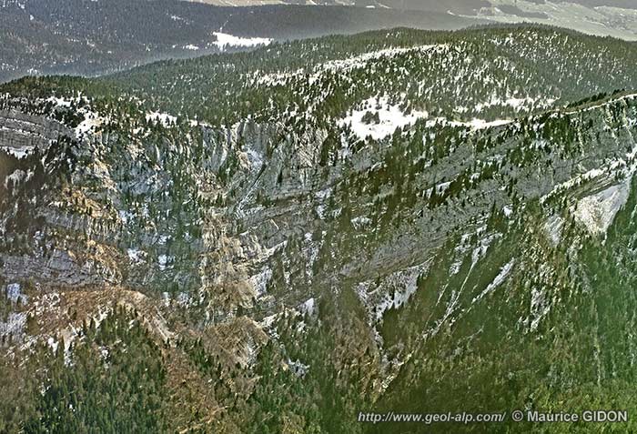 En outre son tracé ne décrit pas, au sud du col de Montaud, l'inflexion anti-horaire que devrait déterminer le changement d'orientation du versant si la cassure y possédait le pendage incliné vers l'est qu'implique ce caractère chevauchant. Au contraire il se poursuit de façon presque rectiligne en dépit des accidents de relief (talweg des ravins et échines les séparant), ce qui atteste de sa verticalité : au sud du ravin de l'Échinard il traverse le versant par un biais descendant, oblique aux tracés de couches, qui débouche finalement sur la vallée de l'Isère peu au nord de Saint-Gervais (voir aussi la page "Saint-Gervais"). |